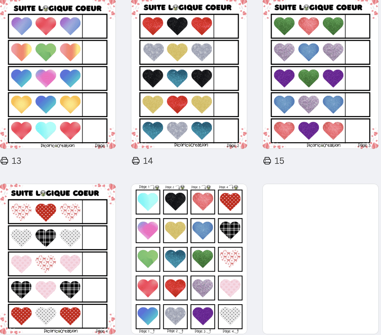 * 4 pages de suite logique de coeur à découper et placer dans les cases correspondantes pour continuer la suite