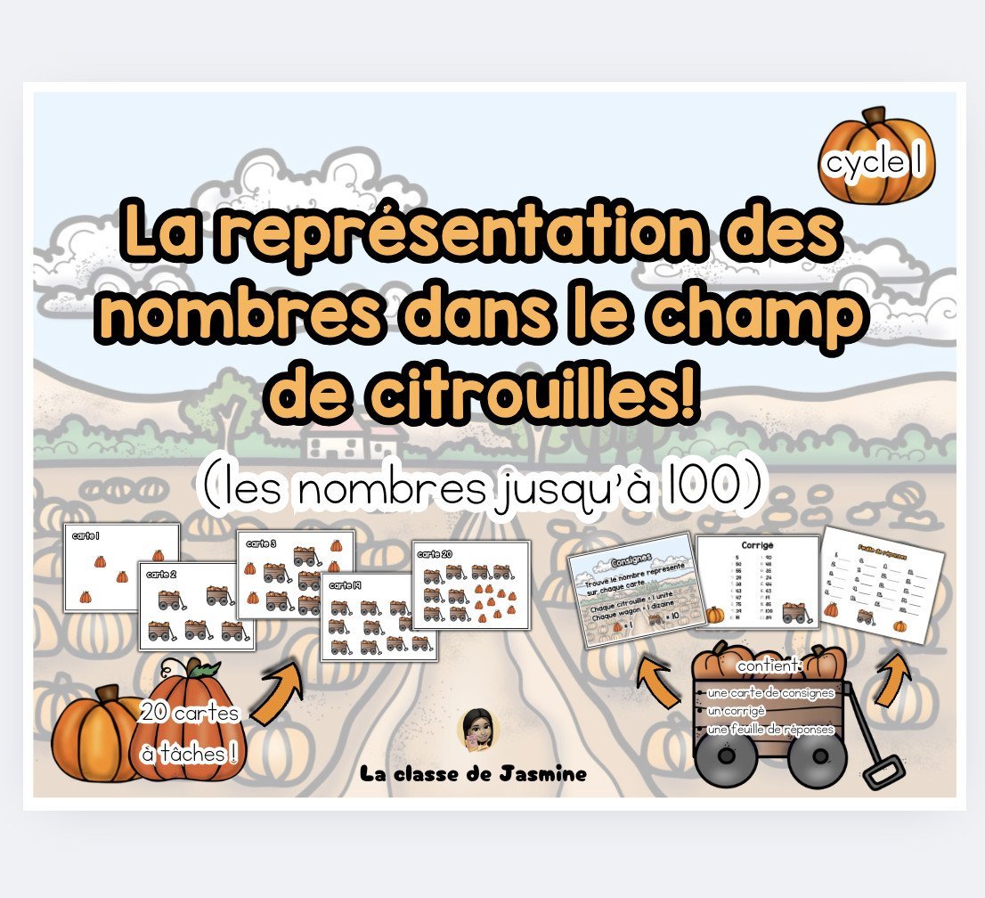 Ce jeu de mathématiques sur le thème de l’automne permet aux élèves de travailler les nombres jusqu’à 100 de façon ludique. À l’aide des cartes à tâches, ils doivent compter les citrouilles (unités) et les wagons (dizaines) pour trouver le nombre représenté.