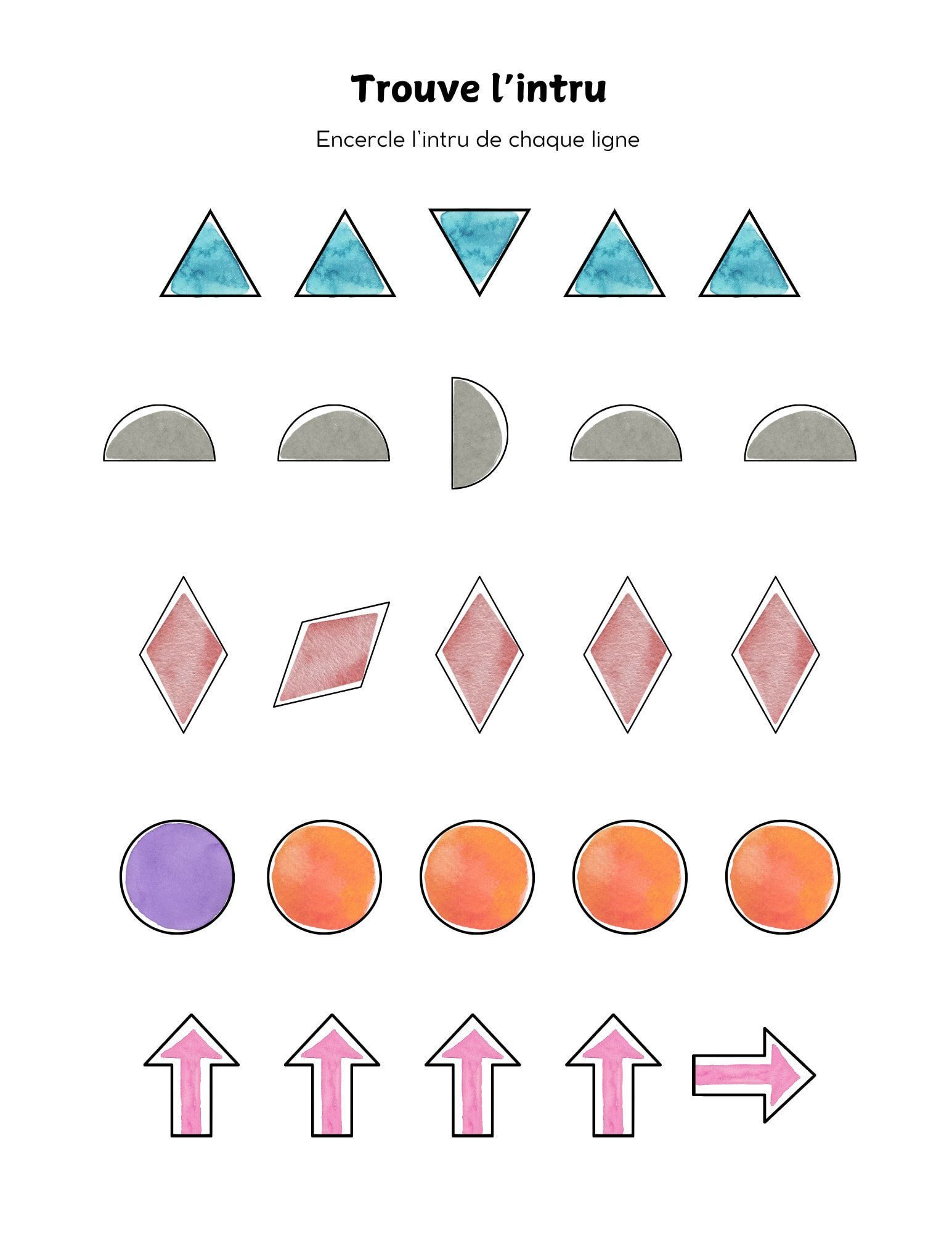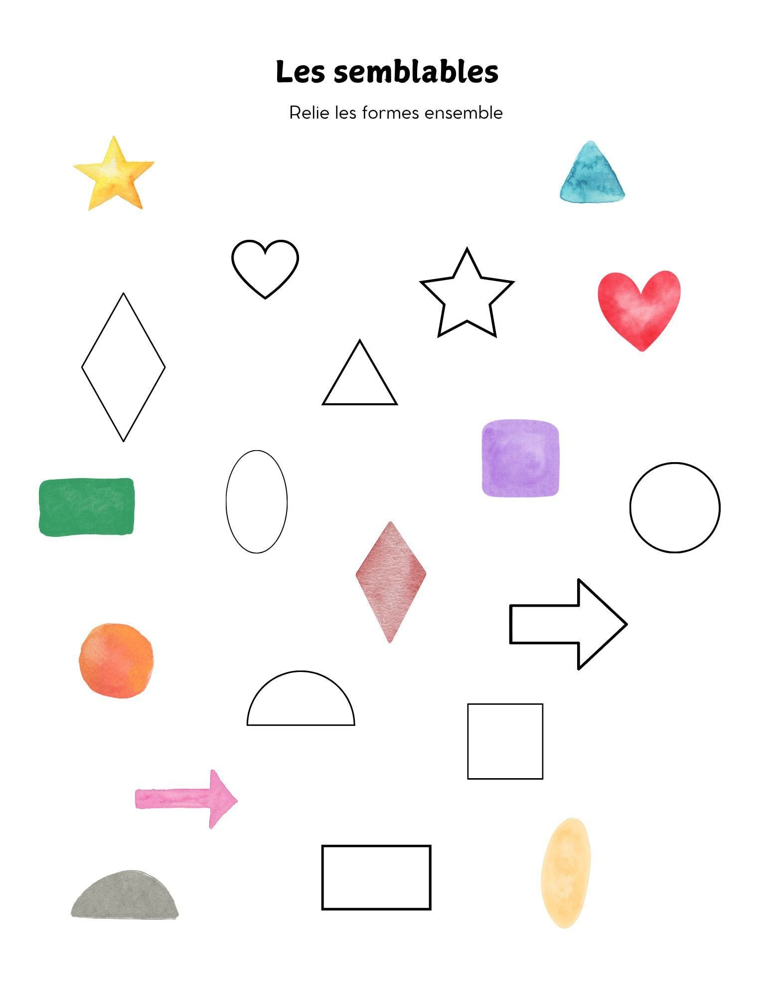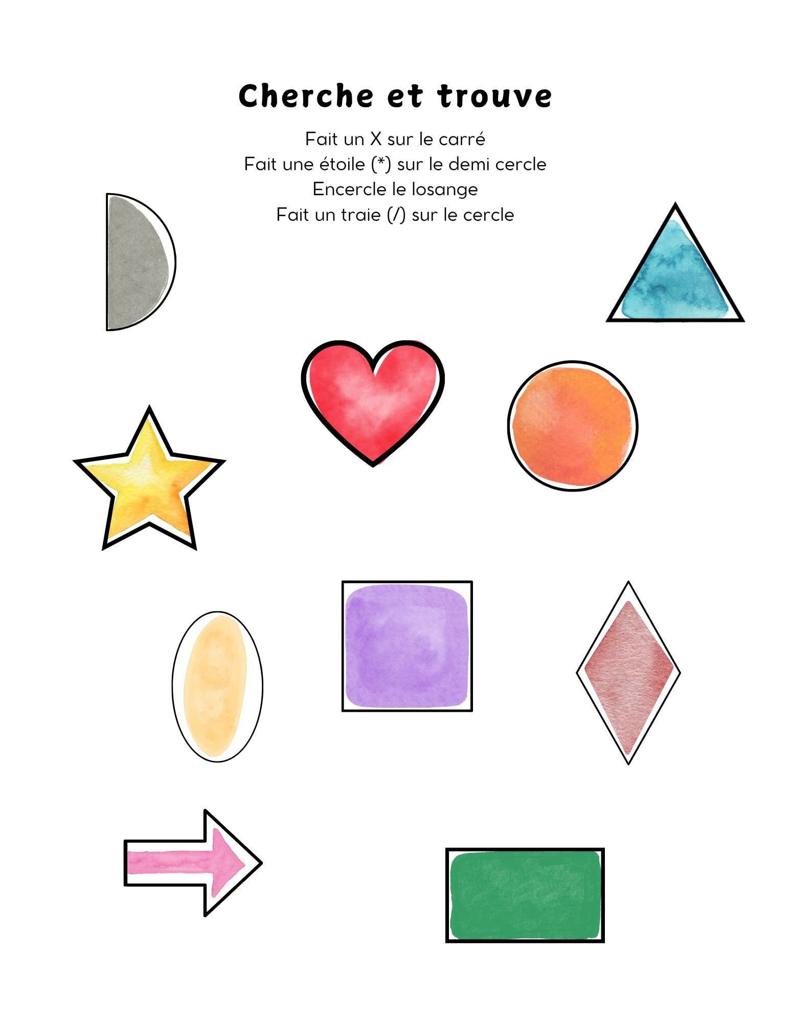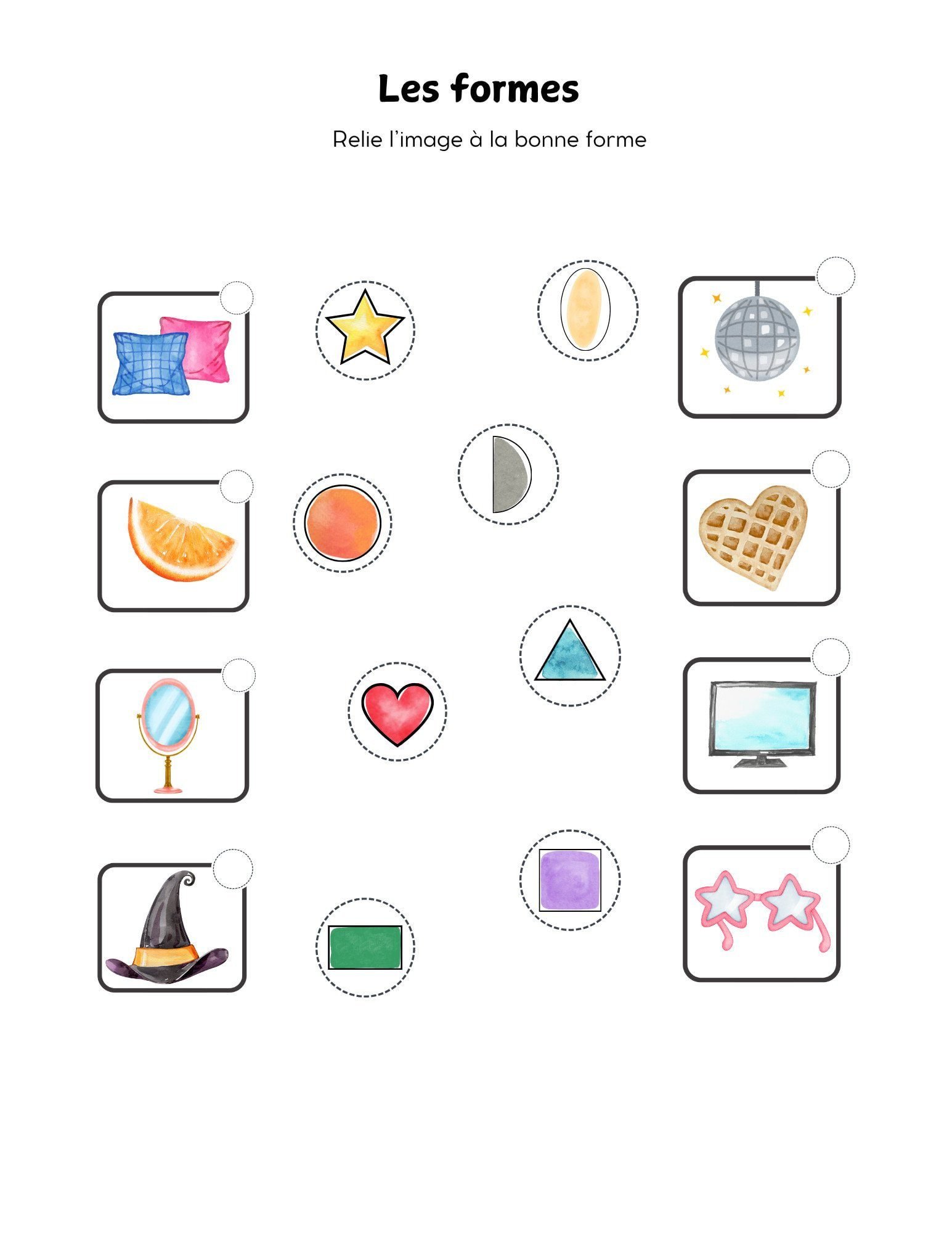 Comprend des activités variées comme la reconnaissance, le coloriage et le tracé de figures planes (carré, cercle, triangle). Il inclut aussi des activités de comparaison et d’association, ainsi que des exercices pour compléter des suites et identifier des formes dans des objets du quotidien, le tout conçu pour un apprentissage ludique et progressif.