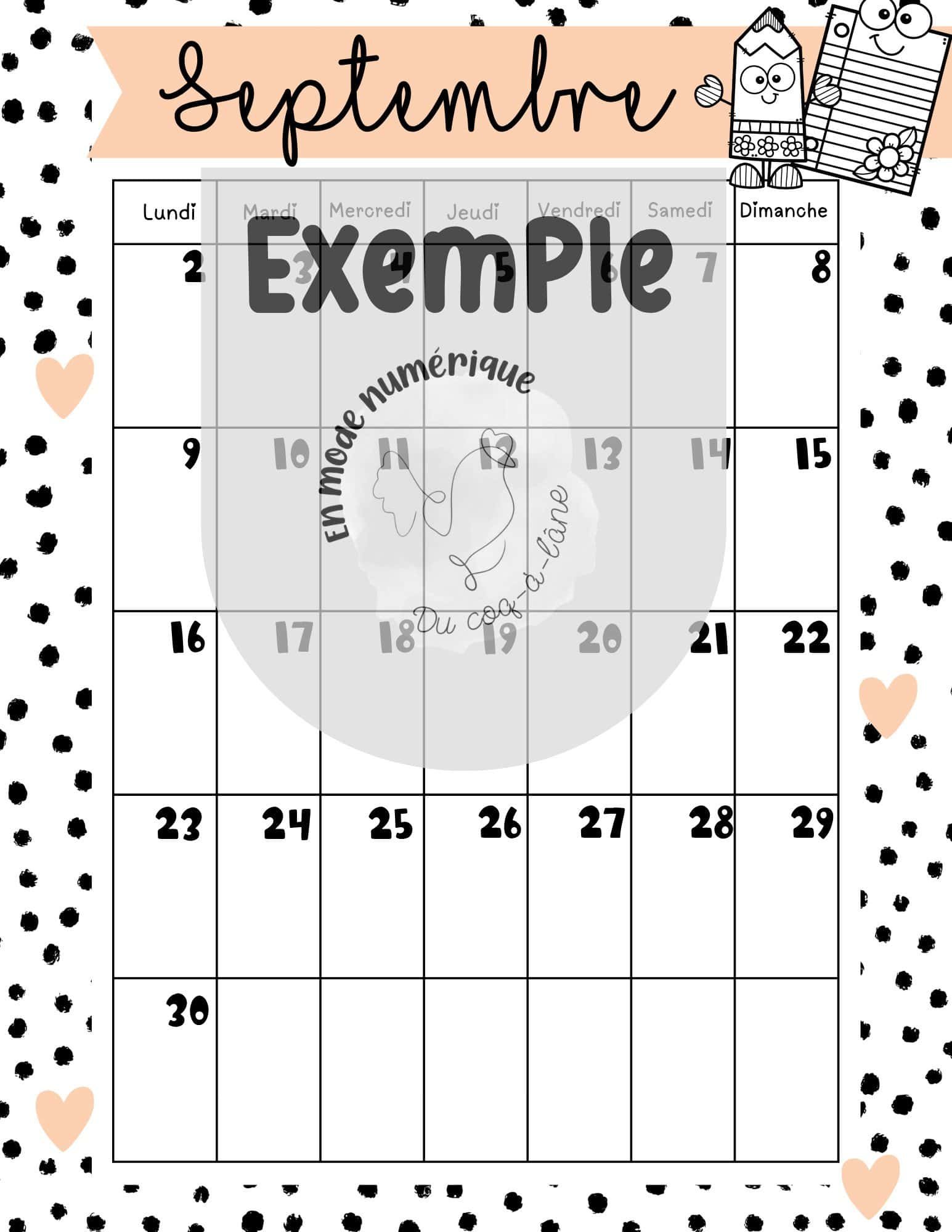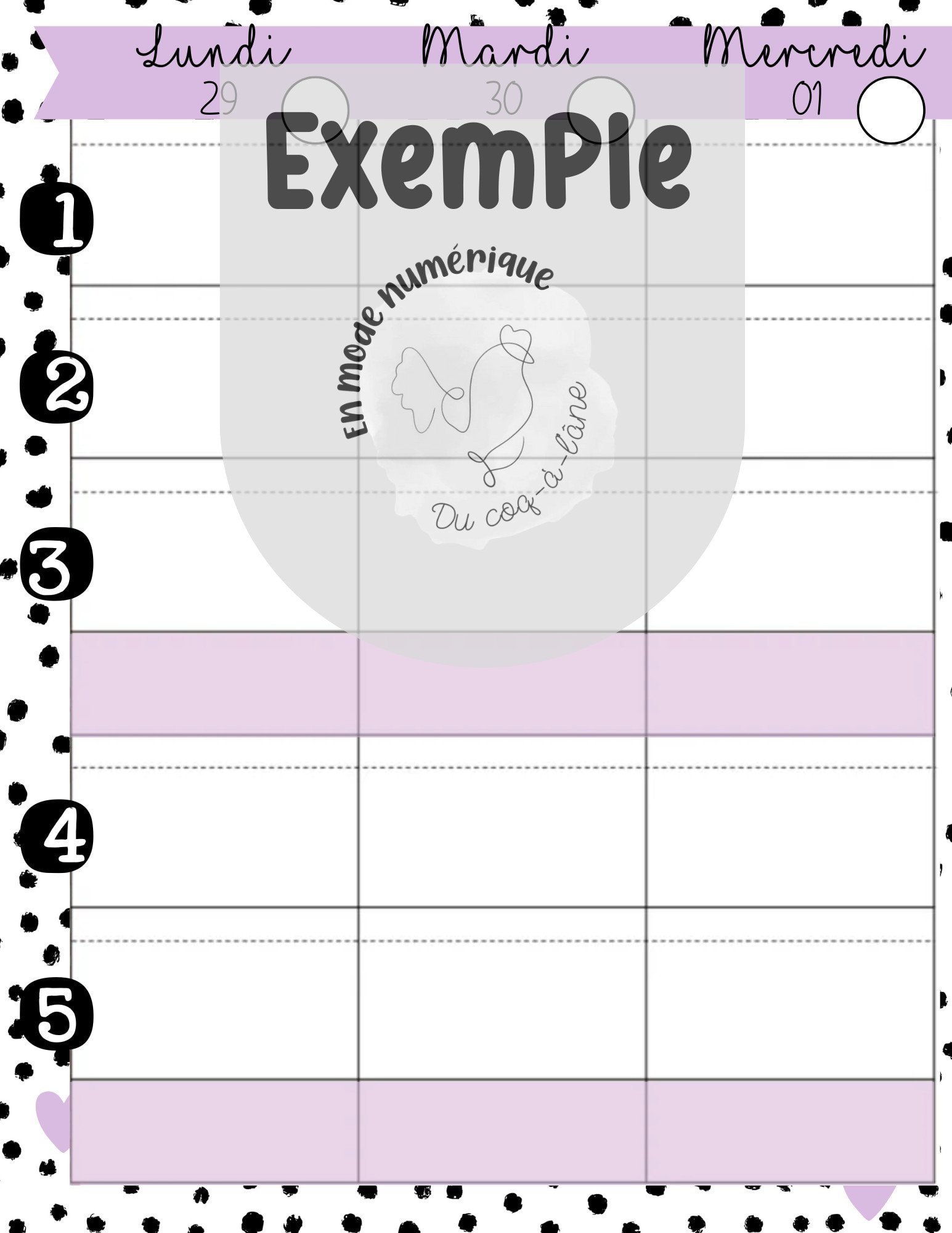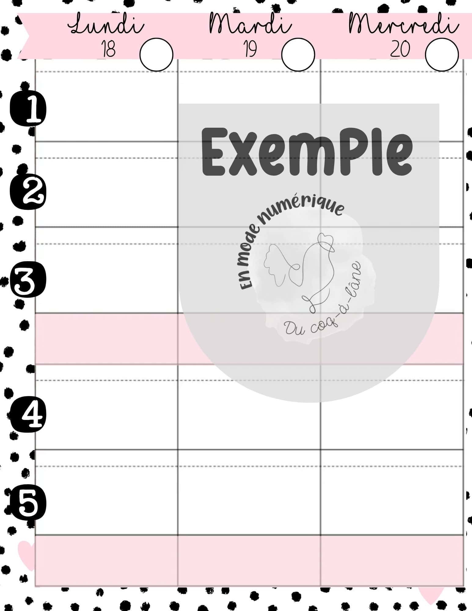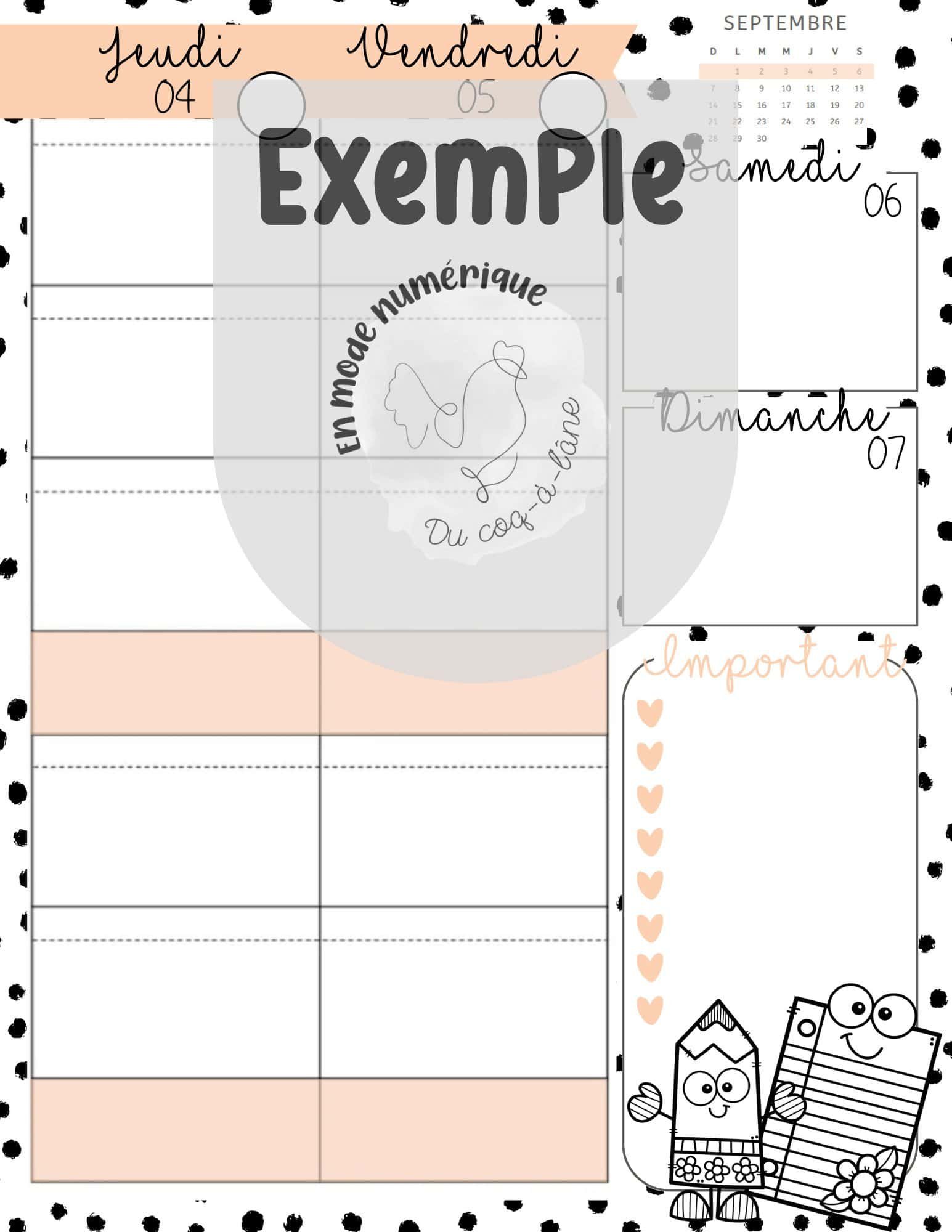 Voici un planificateur à imprimer pour l’année scolaire 2025-2026, conforme à vos demandes : épuré, dans des tons pastels, avec une disposition 3 périodes le matin et 2 l’après-midi, ainsi que plusieurs outils utiles: