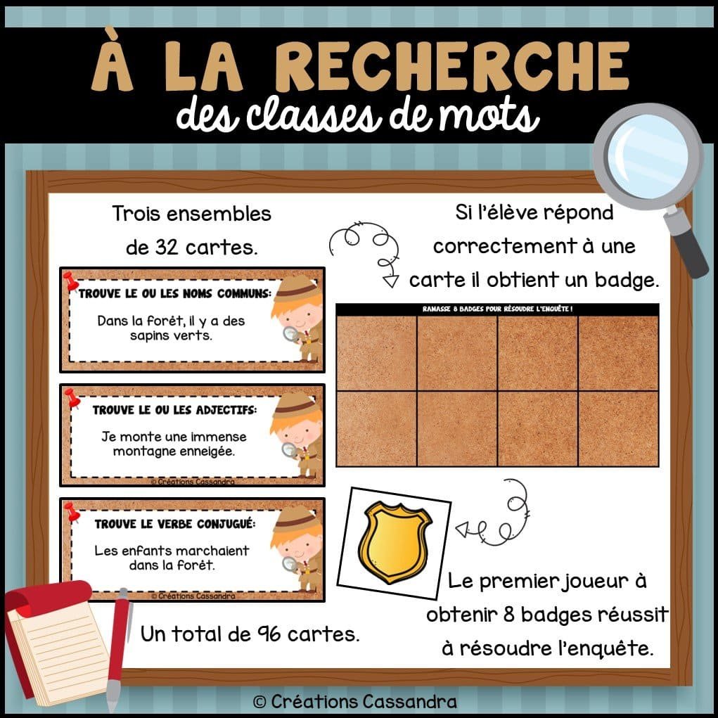 Voici un nouveau jeu dans lequel les élèves devront se mettre dans la peau d’un détective pour identifier les classes de mots demandées sur les cartes. Le jeu est évolutif, c’est-à-dire que vous pourrez l’utiliser à plusieurs reprises tout au long de l’année. Par exemple, vous pourriez utiliser les cartes sur le nom commun au début de l’année, puis ajouter des cartes sur l’adjectif lorsque vous serez rendu à enseigner cette notion. Le jeu contient 96 cartes, soit: