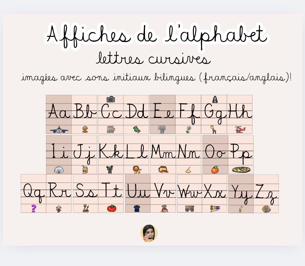 Affiches de l’alphabet (lettres cursives) imagées avec sons initiaux bilingues (français/anglais)!