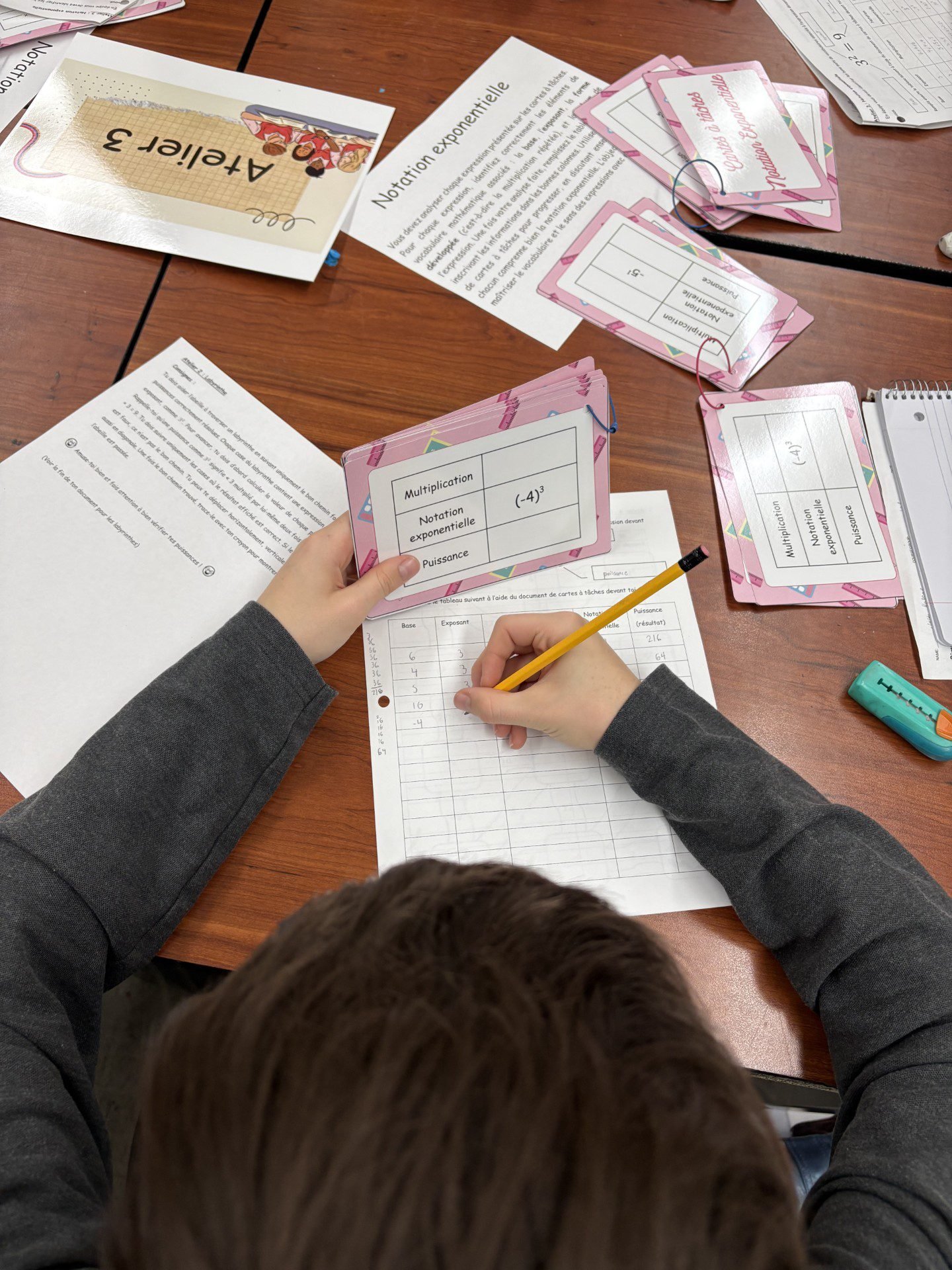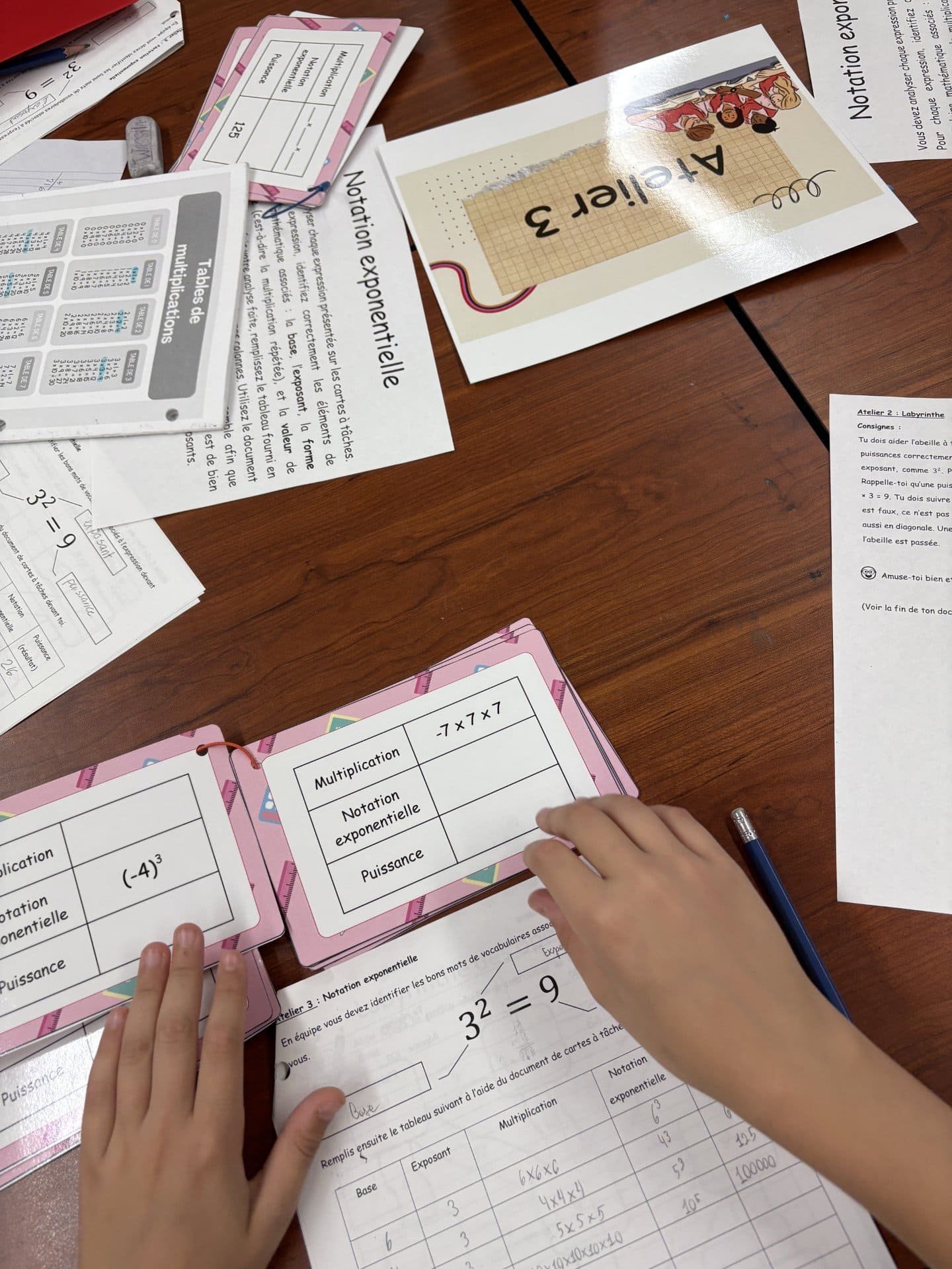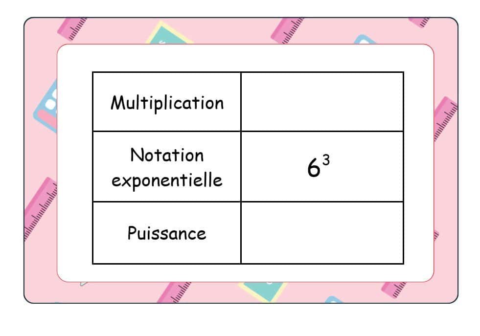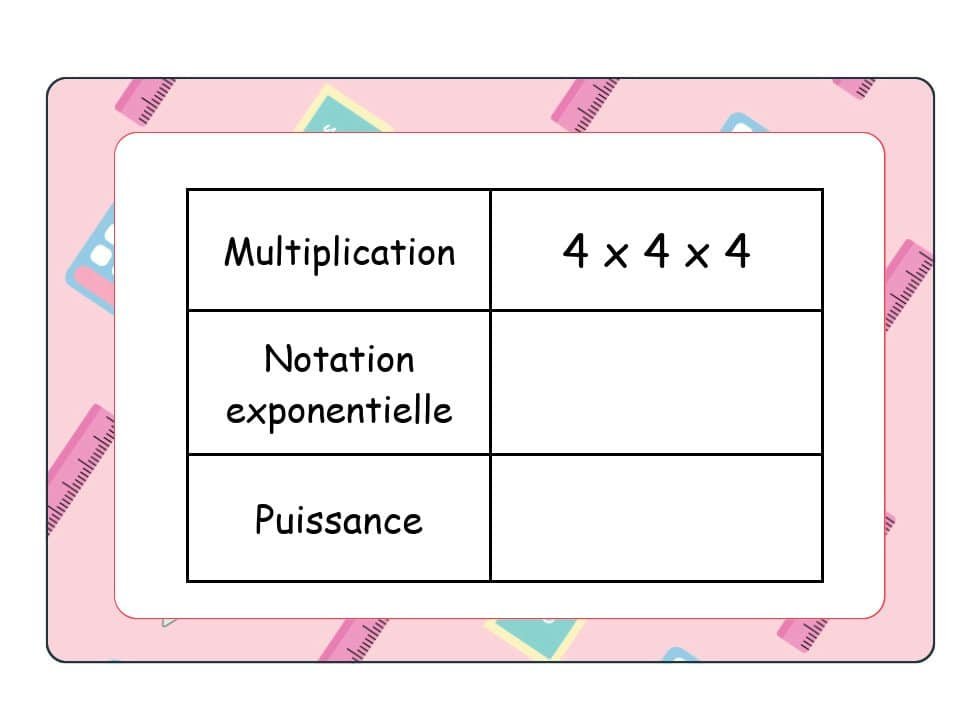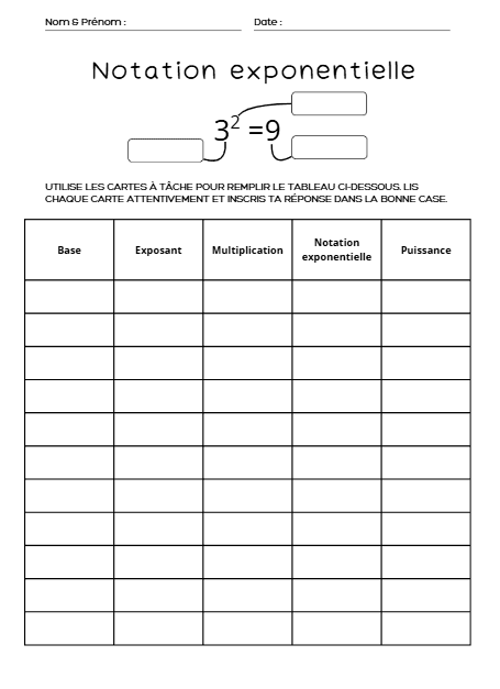 - Chaque élève reçoit un tableau à remplir afin d’associer correctement les éléments d’une expression exponentielle.