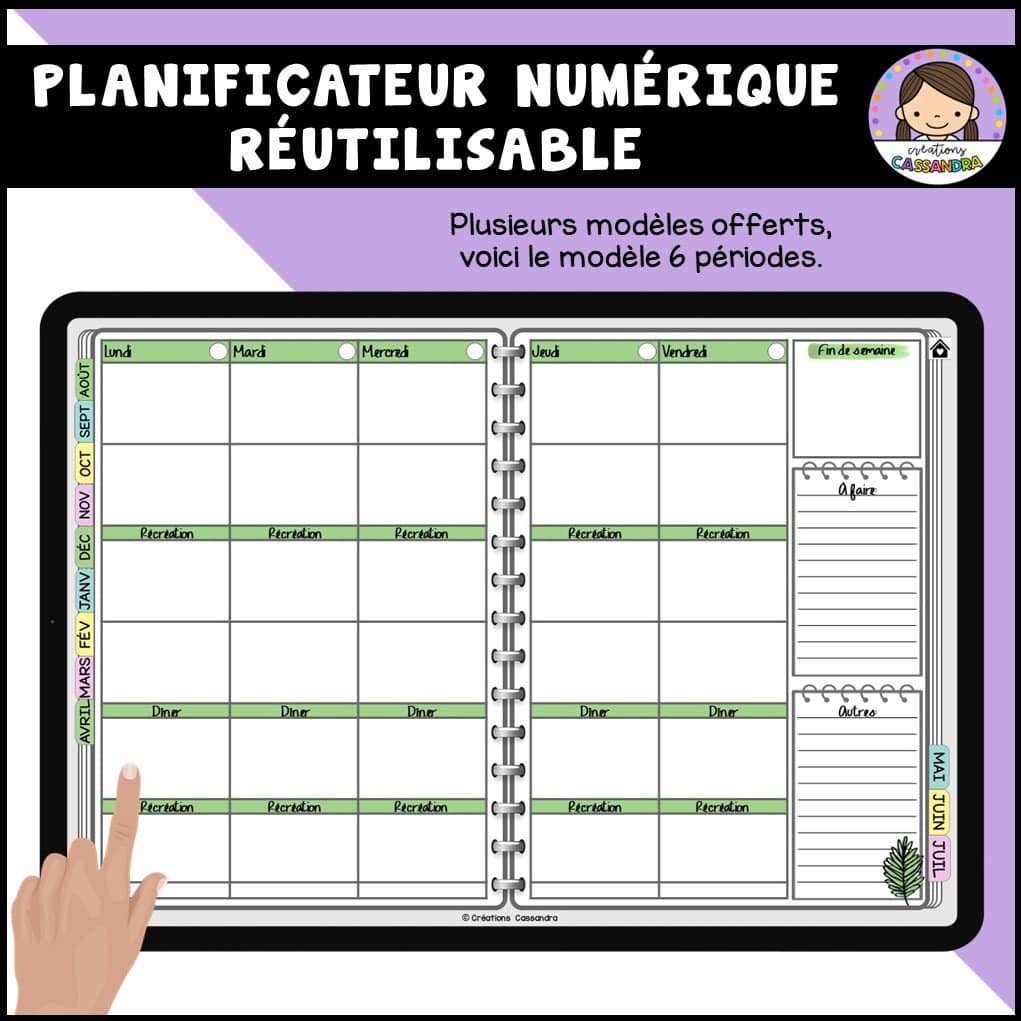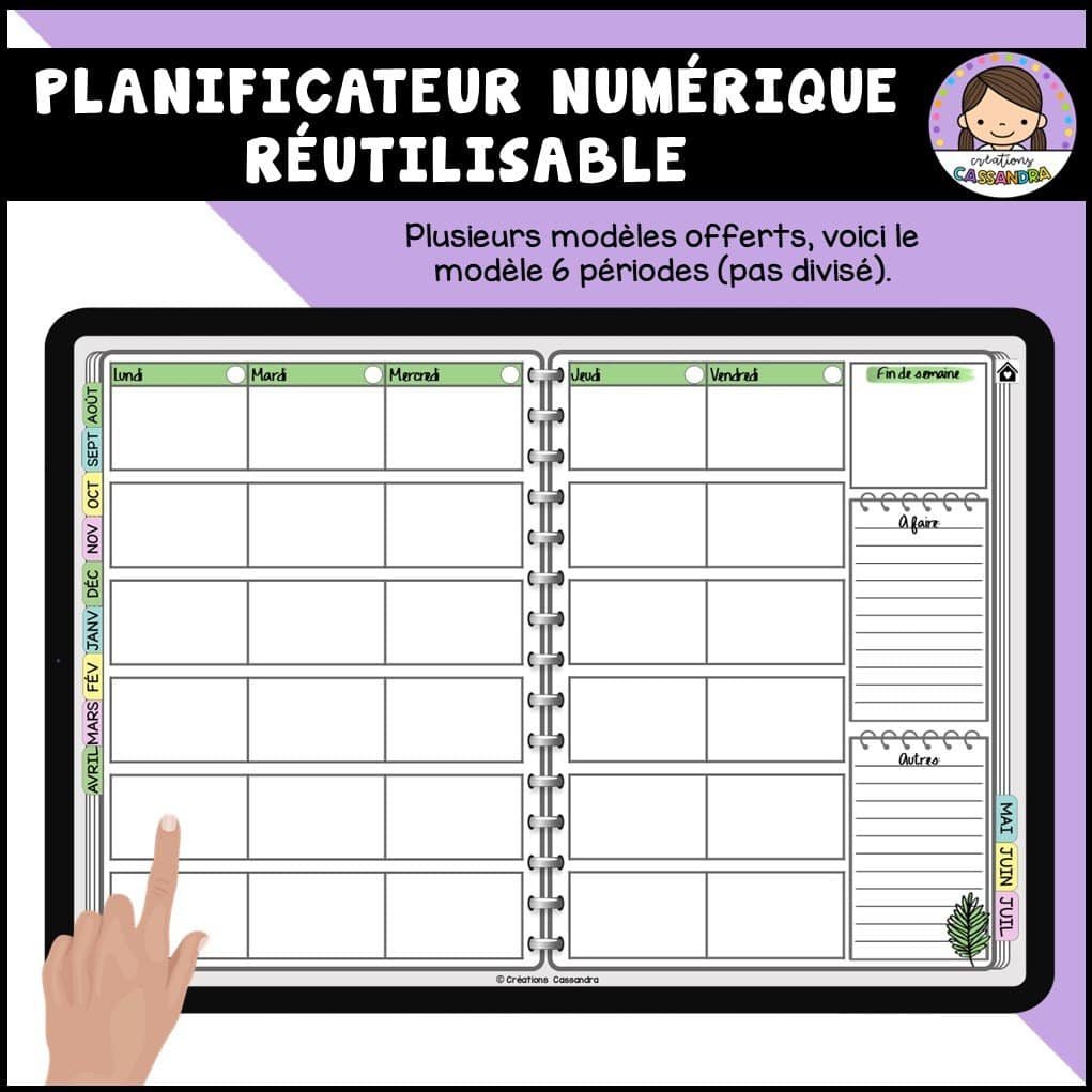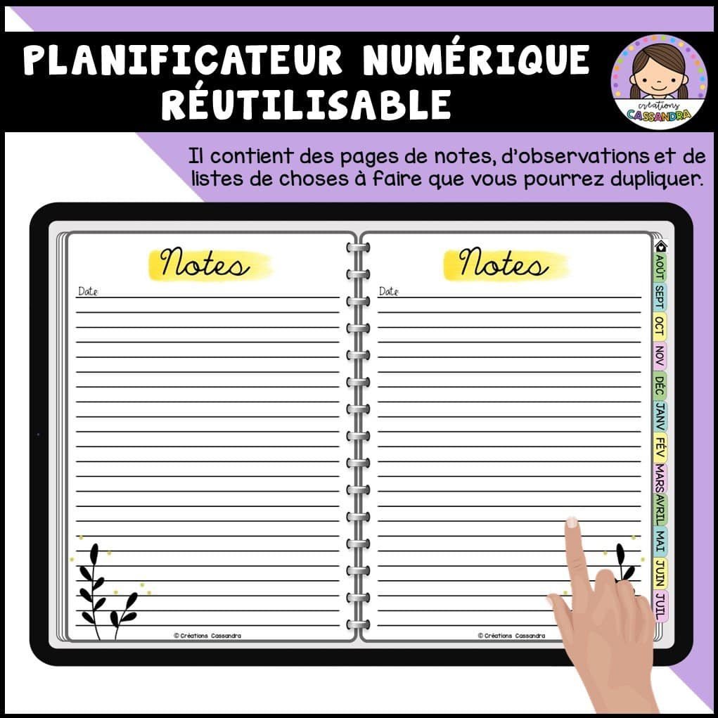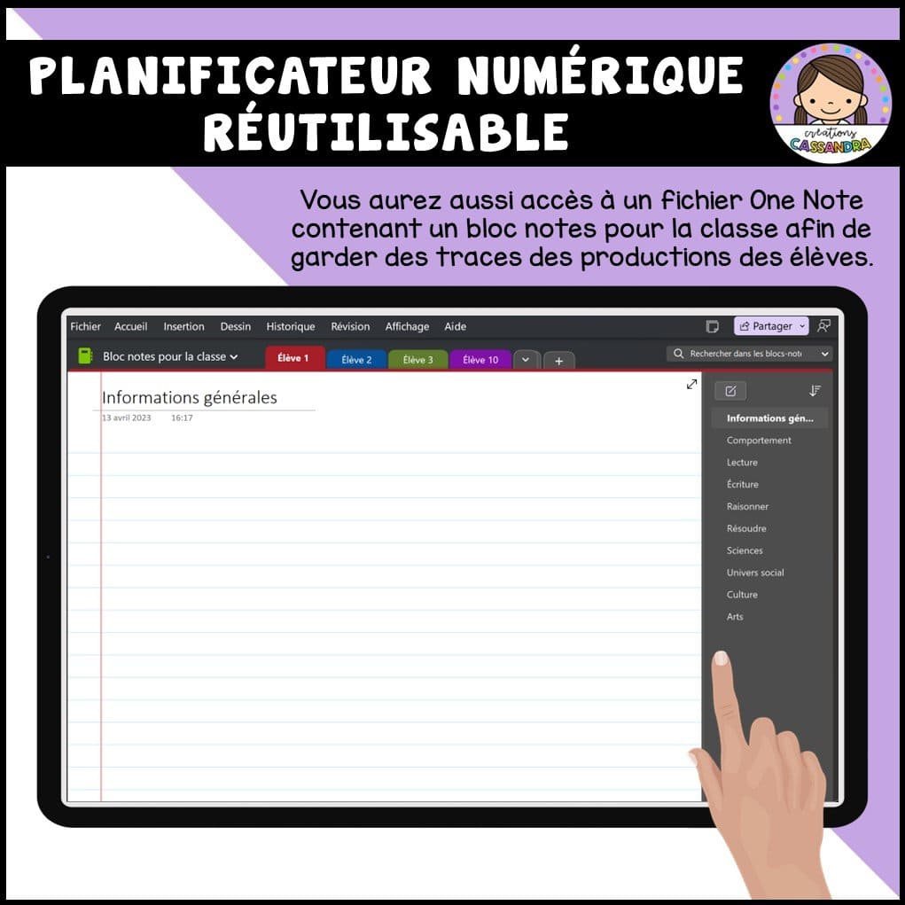 INTRODUCTION Oui, oui, vous avez bien lu, voici un planificateur numérique réutilisable! En d’autres mots, vous devez vous-mêmes inscrire les dates au fil des années, mais vous n’aurez qu’à payer une seule fois. L’avantage d’un planificateur numérique c’est de ne plus avoir besoin de traîner plein de feuilles et de cartables. De plus, vous pouvez l’adapter facilement à vos besoins/outils en supprimant ou en ajoutant des pages. UTILISATION Pour utiliser le planificateur numérique, je vous recommande d’utiliser l’une des applications suivantes:                                                                                      Noteshelf (Android), Good Notes (Apple) ou Notability (Apple) Voici une vidéo qui présente le planificateur dans Noteshelf De plus, vous aurez aussi accès à une version du planificateur dans One Note ainsi qu’un bloc notes de classe dans One Note afin de garder des traces des différentes productions des élèves. C’est terminé les classeurs qui débordent de documents, tout sera au même endroit et vous y aurez accès peu importe où vous vous trouvez! Voici une vidéo qui présente le planificateur et le bloc notes de classe dans One Note  ***Cette vidéo montre aussi comment importer les fichiers One Note dans votre tablette et dans votre ordinateur ainsi que comment les synchroniser. PRÉSENTATION Il y a trois modèles du planificateur, soit un modèle 5 périodes, un modèle 6 périodes ainsi qu’un modèle non divisé de 6 périodes. Dans chacune des versions, vous retrouverez les différentes sections suivantes: