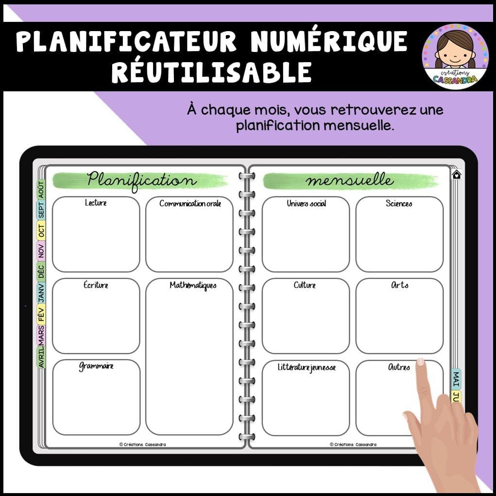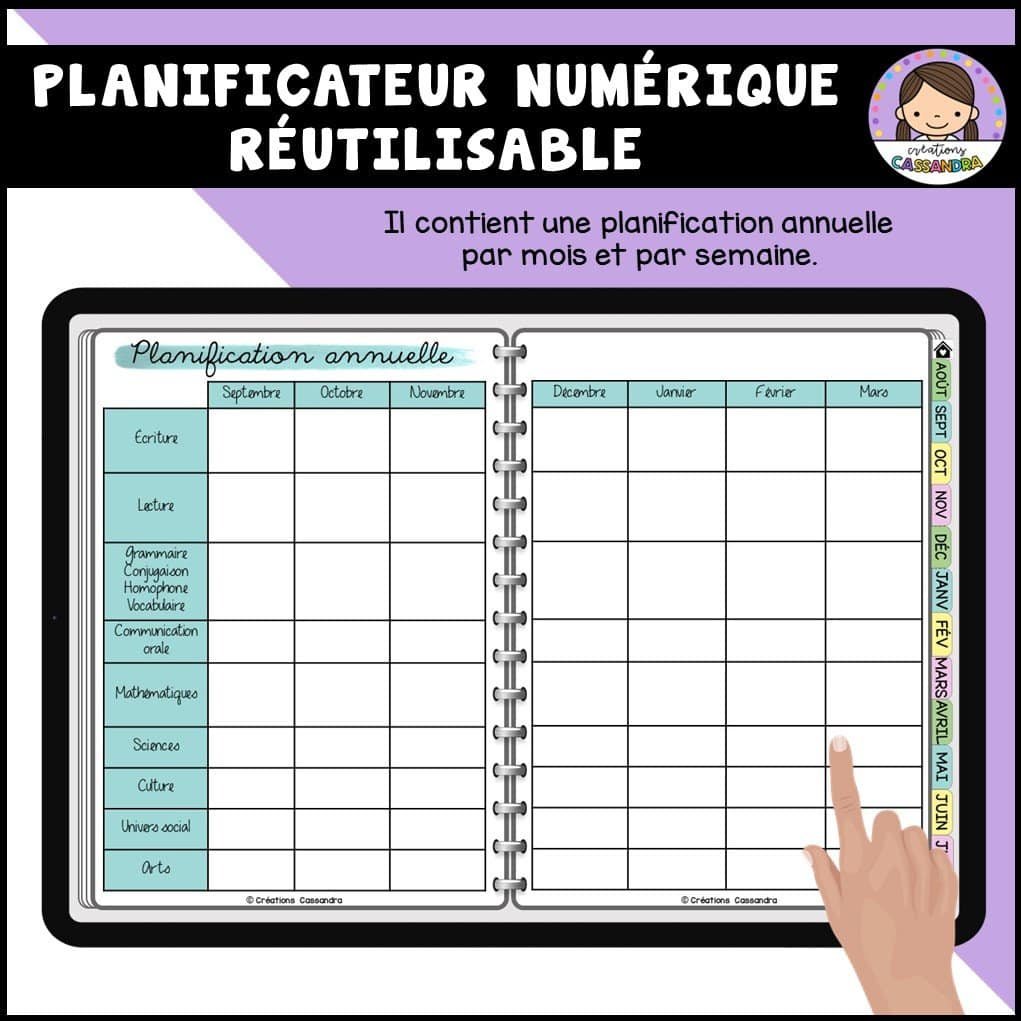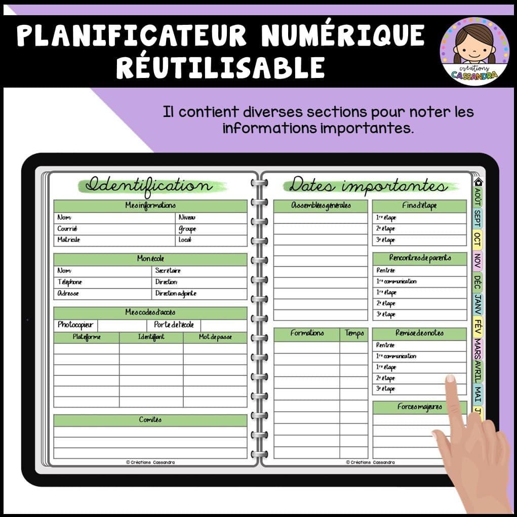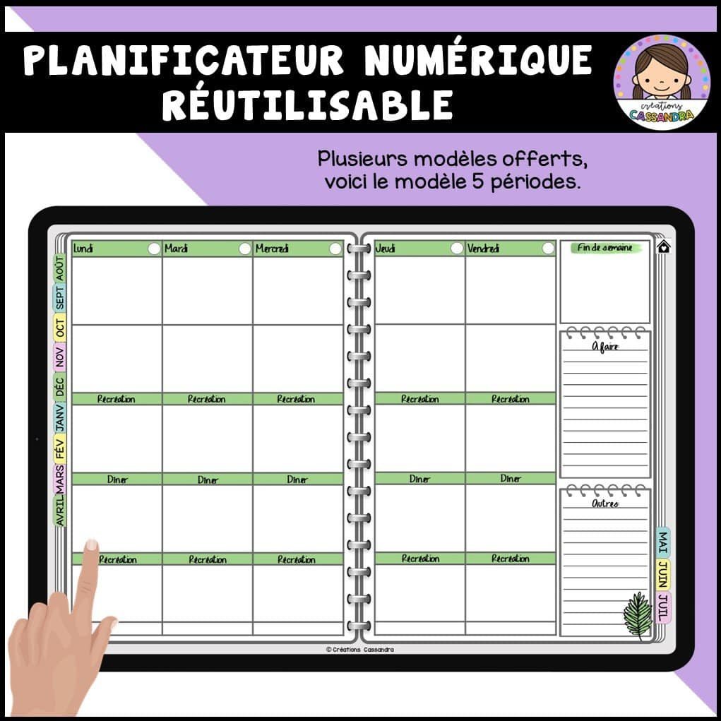 INTRODUCTION Oui, oui, vous avez bien lu, voici un planificateur numérique réutilisable! En d’autres mots, vous devez vous-mêmes inscrire les dates au fil des années, mais vous n’aurez qu’à payer une seule fois. L’avantage d’un planificateur numérique c’est de ne plus avoir besoin de traîner plein de feuilles et de cartables. De plus, vous pouvez l’adapter facilement à vos besoins/outils en supprimant ou en ajoutant des pages. UTILISATION Pour utiliser le planificateur numérique, je vous recommande d’utiliser l’une des applications suivantes:                                                                                      Noteshelf (Android), Good Notes (Apple) ou Notability (Apple) Voici une vidéo qui présente le planificateur dans Noteshelf De plus, vous aurez aussi accès à une version du planificateur dans One Note ainsi qu’un bloc notes de classe dans One Note afin de garder des traces des différentes productions des élèves. C’est terminé les classeurs qui débordent de documents, tout sera au même endroit et vous y aurez accès peu importe où vous vous trouvez! Voici une vidéo qui présente le planificateur et le bloc notes de classe dans One Note  ***Cette vidéo montre aussi comment importer les fichiers One Note dans votre tablette et dans votre ordinateur ainsi que comment les synchroniser. PRÉSENTATION Il y a trois modèles du planificateur, soit un modèle 5 périodes, un modèle 6 périodes ainsi qu’un modèle non divisé de 6 périodes. Dans chacune des versions, vous retrouverez les différentes sections suivantes: